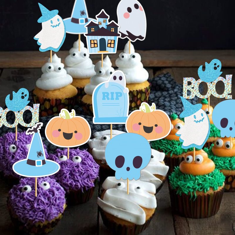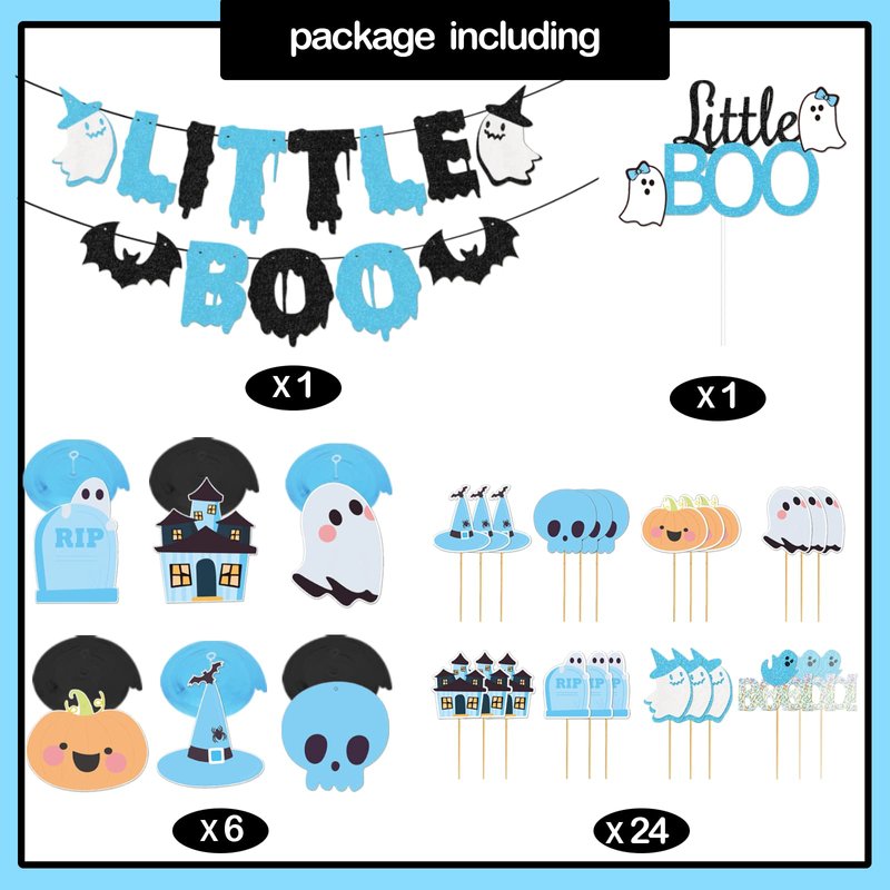 - 【What You Will Get】: 1 pcs blue and black little boo day Banner, 6 pcs blue halloween baby shower party hanging swirl 1pcs blue little boo cake topper 24pcs blue baby shower cupcake topper. The halloween birthday party decorations provide everything you need to decorate your birthday party!