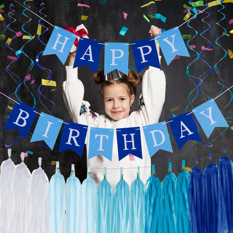- What you will get: 1Pcs Felt Blue Happy Birthday Banner,12Pcs Hanging Swirl Streamers,15 Pcs Blue & Light Blue & White Tissue Paper Tassels Garland(Each color have 5pcs tassels,Easy DIY).Perfect for All Birthday Party Decoration Supplies.