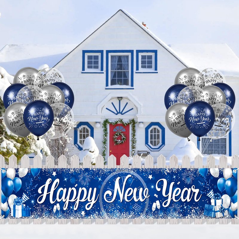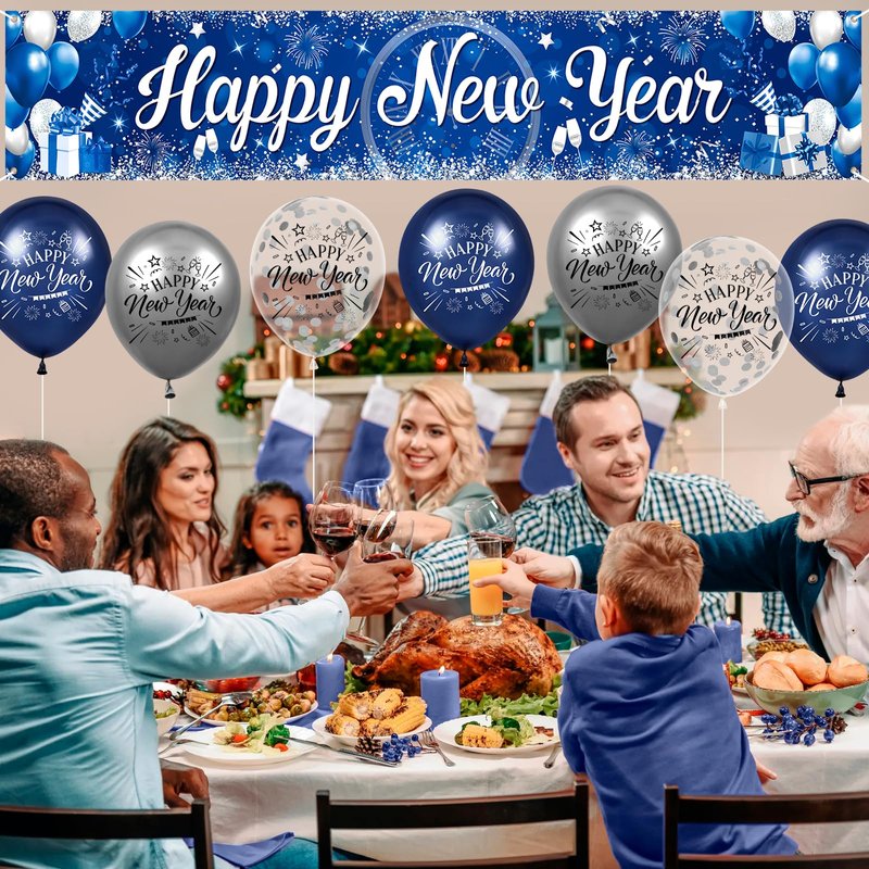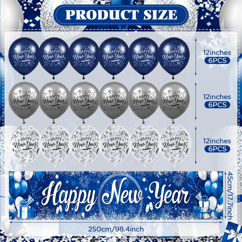 • New Year Decorations: You will get a blue and silver Happy New Year banner and 18 latex 2025 New Year balloons with "Happy New Year" printed on them, which will be an impressive 2025 New Year decoration that can brighten up your New Year's Eve party