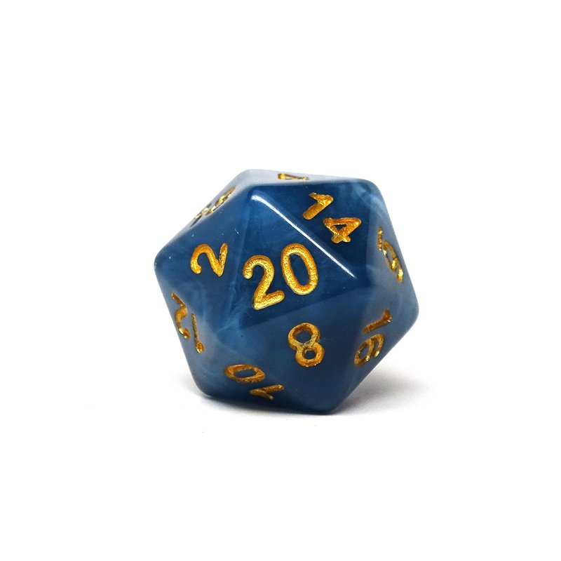 The Blue Ivory Dice Set showcases a blend of flat blue tones with a subtle swirl finish. Each set features gold numbering and includes a free small dice bag.