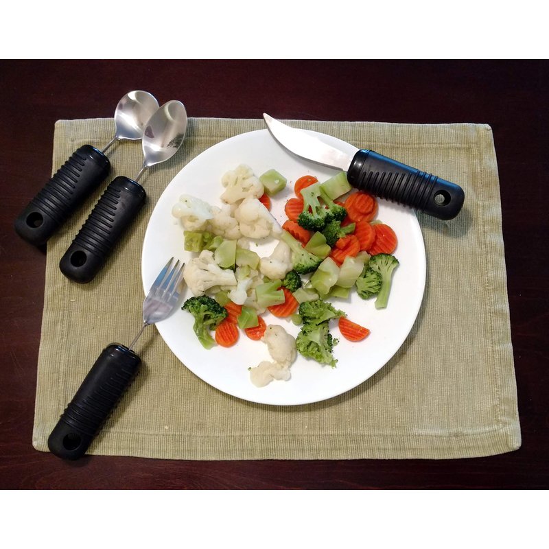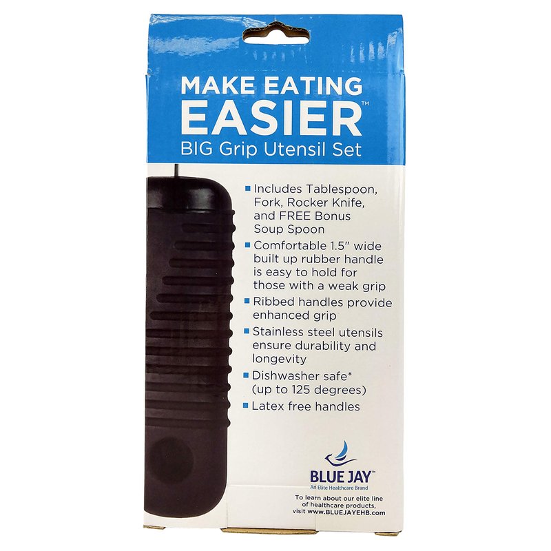 - Utensil Set: Blue Jay Make Eating Easier Big Grip Utensil Set includes a fork, tablespoon, rocker knife and a bonus soup spoon free of cost.