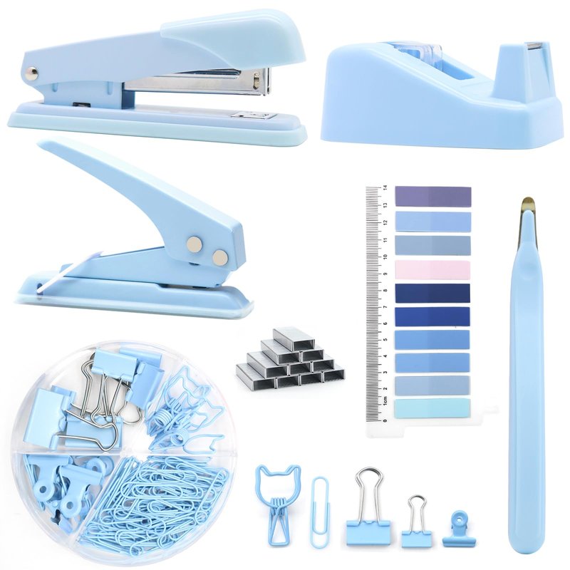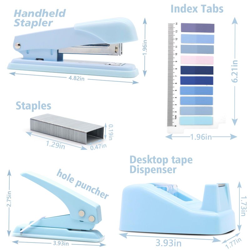- Package Includes - This blue office supplies contains 1x Stapler, 1x Magnetic Staple Remover, 1000x Staples, 1x Tape Dispenser, 1x Single Hole Punch,4x Bulldog Clips 4x Small Clips 2x Hollow clip 2x Big Clips 70x Paper Clips and 10 colors Tabs with ruler. Beautiful and lovely blue desk accessories combination can meet your daily office and study needs.