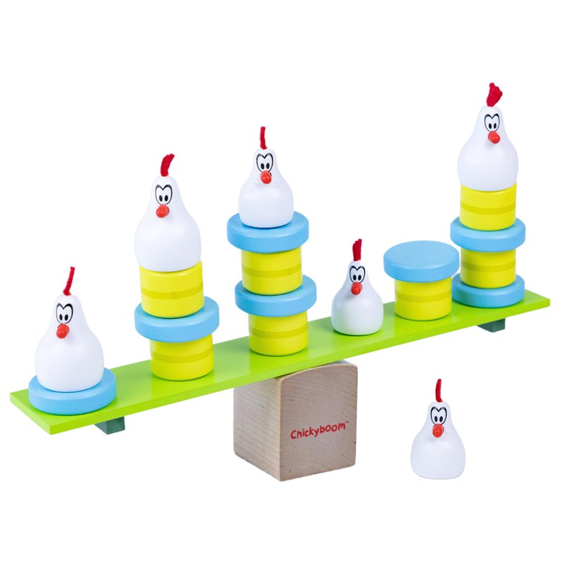 - This fun wooden balancing game INCLUDES 6 fun chickens, 7 hay bales, 7 wagon wheels, a barn, a perch, simple and kid friendly instructions. Chickyboom makes a great addition to your kindergarten, homeschool, or preschool learning toys and games collection