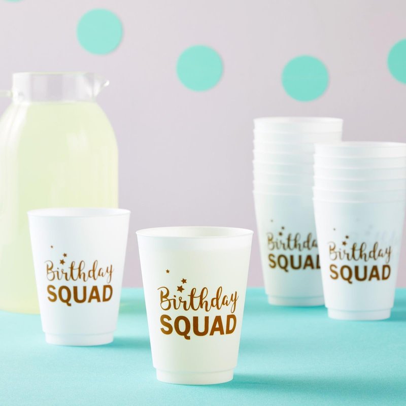 - Happy Birthday Cups: Complete your party decorations with our birthday squad cups featuring gold accents that are sure to add a fun and elegant touch to any snack bar or table setting