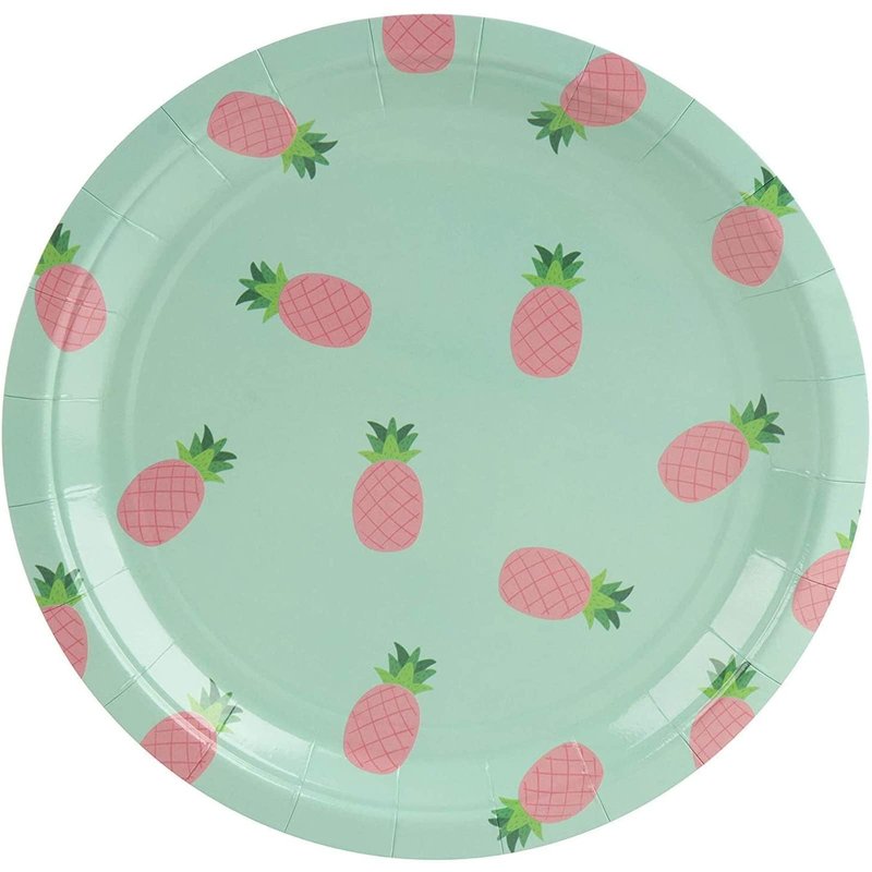 - TROPICAL PINEAPPLE PARTY PACK: Includes enough tableware for 24 guests; contains 24 of each of the following: Knives, Spoons, Forks and Paper Plates, Napkins and Cups. The silverware is in a pastel pink color while the paper plates, napkins and cups feature pink pineapples, palm trees, and pink and white stripes.