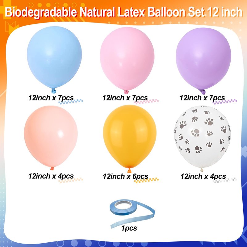 - 12 Inch Pastel Puppy Set - Package includes 36 pieces latex party balloons: Paw Print Balloons (12-in x 6), Pastel Sky Blue Balloons (12-in x 7), Pastel Pink Balloons (12-in x 6), Pastel Purple Balloons (12-in x 7), Pastel Orange Balloons (12-in x 5), Mustand Yellow Balloons (12-in x 5), Blue Ribbon 10 Meters long x 1. The stylist's exclusive color combination features bright hues with a playful, childlike charm.