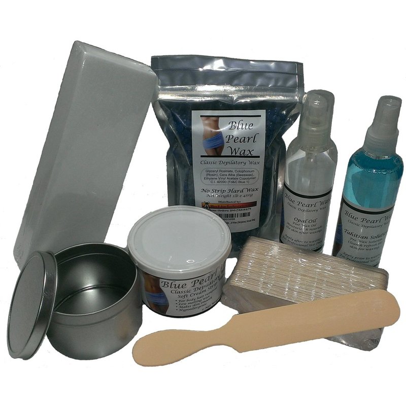 - This kit includes: Qty 1 Blue Pearl Wax Ocean Tide Bead Hard Wax (Stripless) Small Bag Qty 1 Blue Pearl Wax Crystal Lagoon Soft Wax (Strip) 400g (14 oz) Can Qty 1 Blue Pearl Wax Tahitian Solution Pre Wax Solution 250 ml (8oz) Qty 1 Blue Pearl Wax Opal Oil Post Wax Solution 250 ml (8oz) Qty 1 Large Wide Wood Stick 6" x 3/4" Qty 100 Qty 1 Large Hard Plastic Waxing Spatula 9.5" x 1.5" Qty 1 Disposables Non-Woven Strips - 100/Pk Qty 1 Empty Tin with Lid