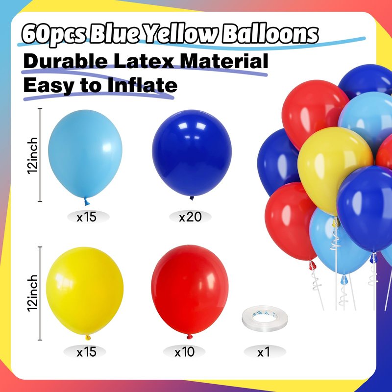 - LATEX BALLOONS: Red blue yellow balloons, made of natural latex, ensuring safety and durability; please note that latex balloons may exhibit slight color variations when uninflated, becoming more vibrant and full-bodied once inflated; additionally, color variations may occur due to different monitor settings and lighting conditions, which is normal