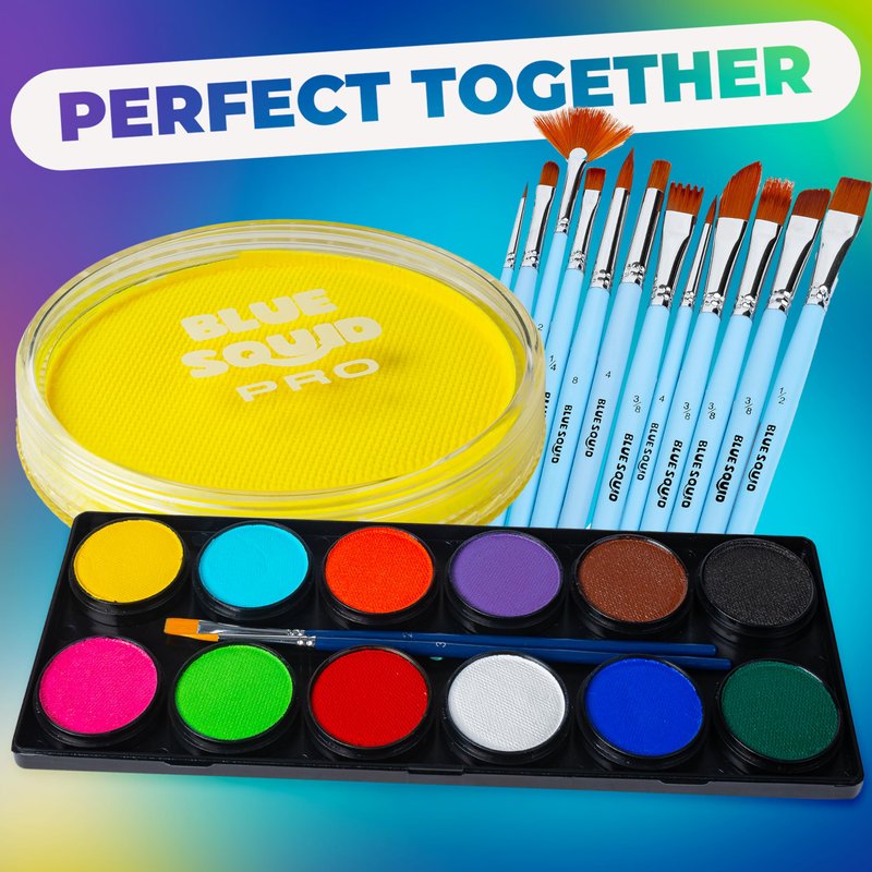 Transform your creative visions into reality with Blue Squid's Professional Face Paint Make up. Whether you're preparing for a cosplay event, a theater performance, or a fun-filled Halloween night, our water-activated face paint offers the perfect blend of skin-friendly ingredients, cream like formula and vibrant colors. The includes a variety of shades, including the highly sought-after white face paint, as well as pink, blue, black, yellow face paint, and many more - ideal for creating standout looks such as clown makeup, corpse paint, or even intricate cosplay designs. Our face paint is water-based, making it easy to apply and remove, ensuring a hassle-free experience for both beginners and professionals. The hypoallergenic face paint & body paint palette is designed to be non-toxic and fragrance-free, making it safe for all skin types, including sensitive skin. With Blue Squid's face paint, you can achieve natural professional-grade results without worrying about skin irritation or allergic reactions. One of the standout features of our face paint is its versatility. From face paints and bodypaint for skin to detailed face painting, our body paint accessories cater to a wide range of artistic needs. The water-activated formula ensures that the paint remains vibrant and smudge-proof throughout the day, making it perfect for long events. Blue Squid's Professional Face Paint Palette is a must-have for anyone serious about their craft. Whether you're a seasoned artist or a novice exploring the world of face and body painting, our washable face paint provides the tools you need to bring your ideas to life. With its easy application, skin-safe ingredients, and professional finish, it's no wonder why Blue Squid is a trusted name in the world of face paint.