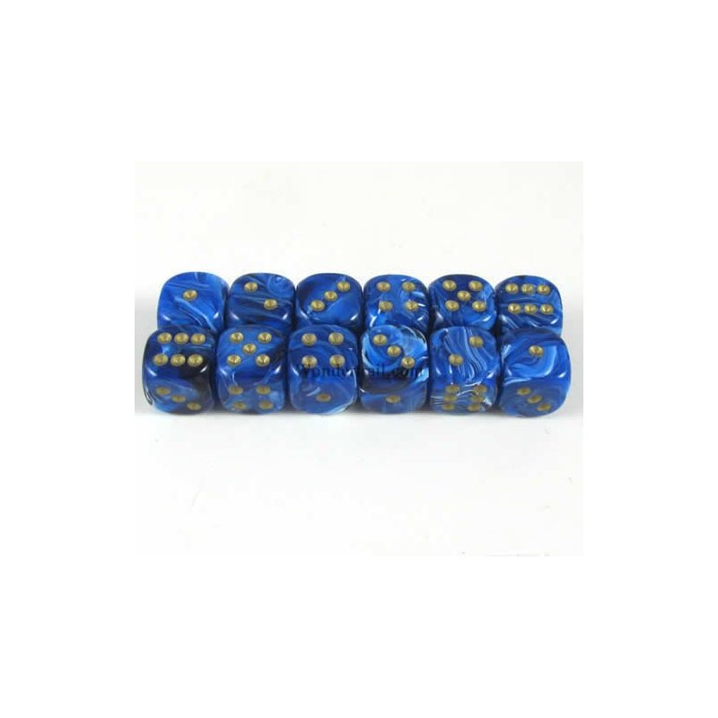 Blue Vortex with Gold Pips 12mm D6 Dice Set of 12 Wondertrail WCX27836E12