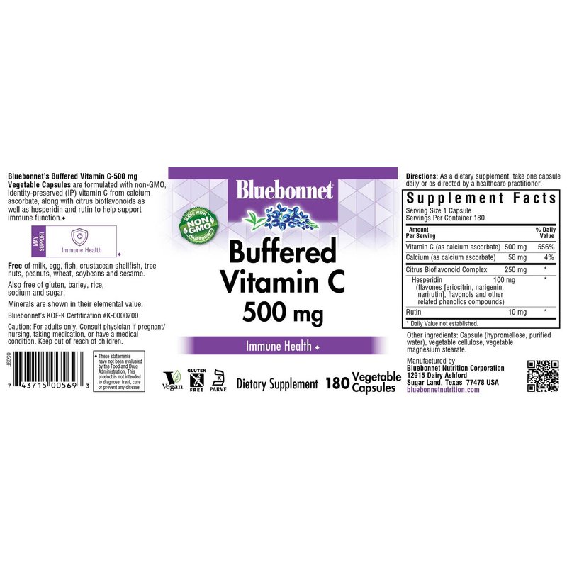 Bluebonnet Nutrition Buffered Vitamin C-500 mg Vegetable Capsules, Buffered Calcium Ascorbate, for Immune Health, Soy Free, Gluten Free, Non-GMO, Kosher, Dairy Free, Vegan, 180 Vegetable Capsules