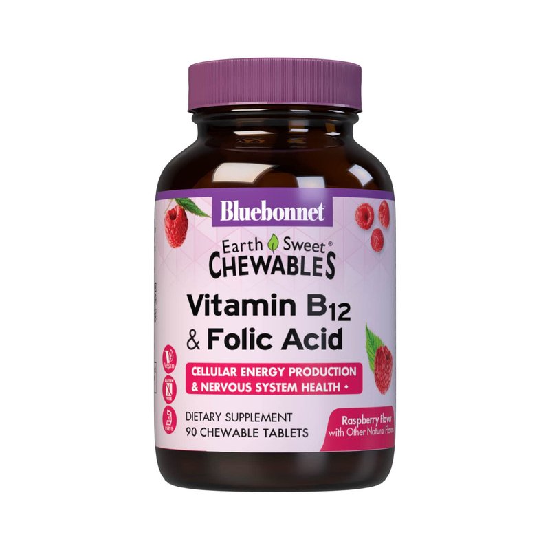 BlueBonnet Nutrition Earth Sweet Vitamin B12 & Folic Acid Chewable Tablets, Soy-Free, Gluten-Free, Raspberry 90 Count (Pack of 1)