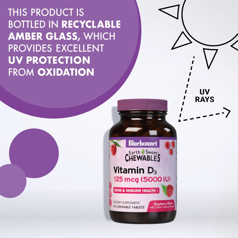 Bluebonnet Nutrition Earth Sweet Vitamin D3 5000 IU Chewable Tablets, Aids in Muscle & Skeletal Growth, Non GMO, Gluten & Soy & Milk Free, Kosher, Raspberry, White, 90 Count