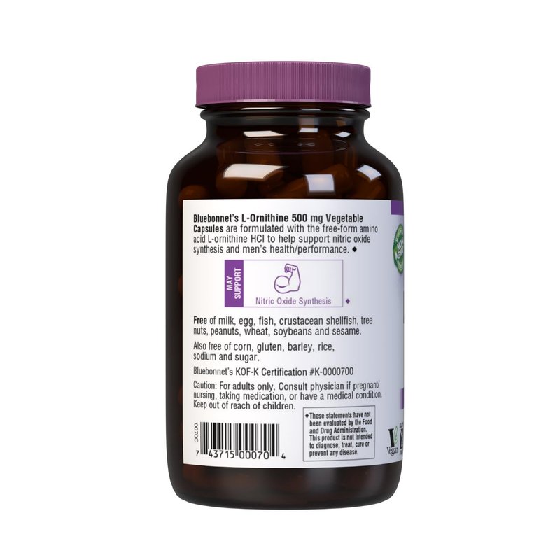 Bluebonnet Nutrition L-Ornithine 500mg, Free-Form Amino Acid, for Healthy Protein Metabolism*, Soy-Free, Gluten-Free, Non-GMO, Kosher Certified, Vegan, 100 Vegetable Capsules, 100 Servings