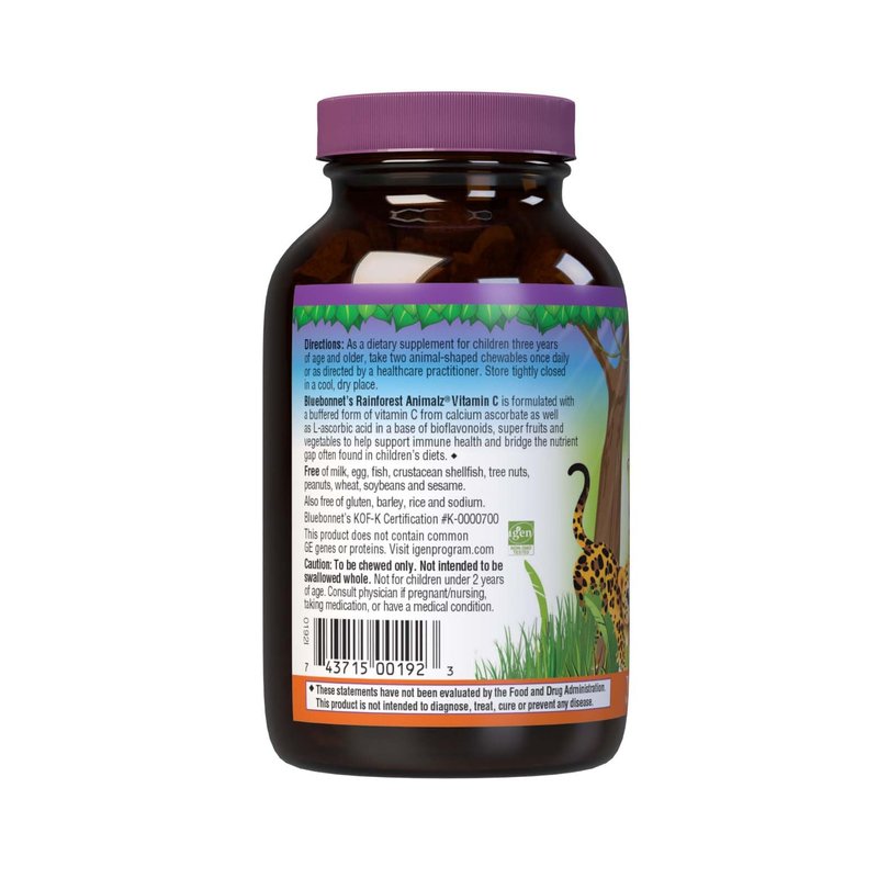 Bluebonnet Nutrition Rainforest Animalz Vitamin C Animal Shape Chewable Tablets, 250mg of Vitamin C, Soy-Free, Gluten-Free, Kosher Certified, Dairy-Free, Vegan, 90 Tablets, 45 Servings, Orange Flavor