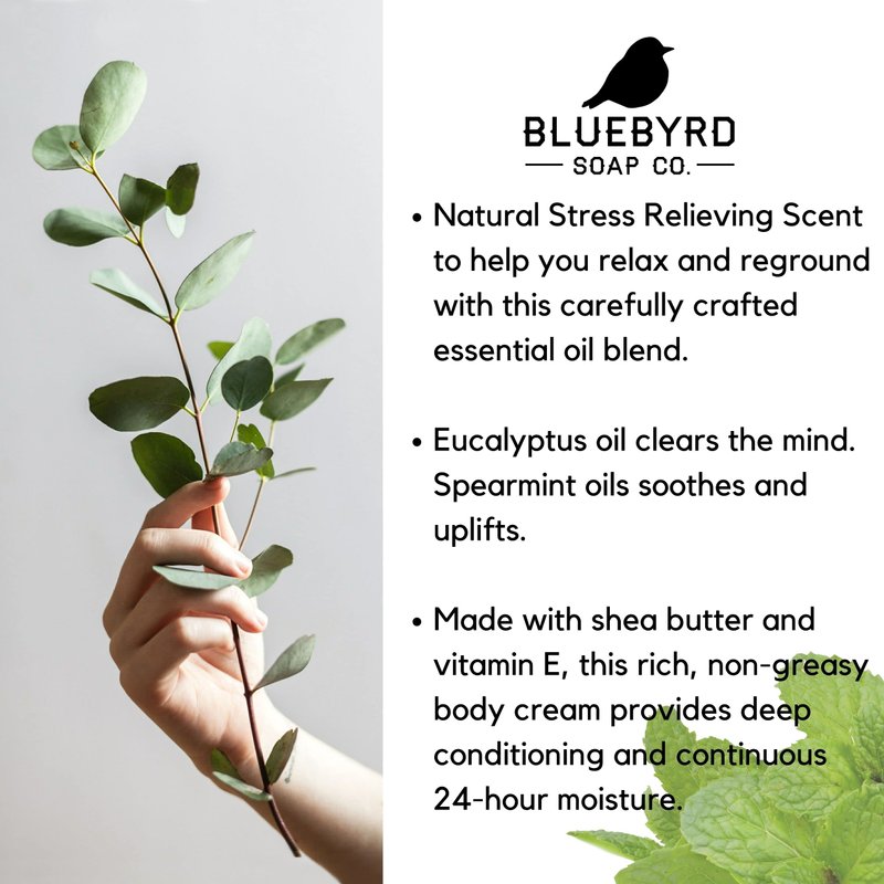 Bluebyrd Soap Co. Eucalyptus Mint Body Butter | Relaxing Whipped Body Cream for Men and Women | Non-Greasy Moisturizing Dry Skin Lotion for Hands, Body & Feet 8oz. jar(EUCALYPTUS)
