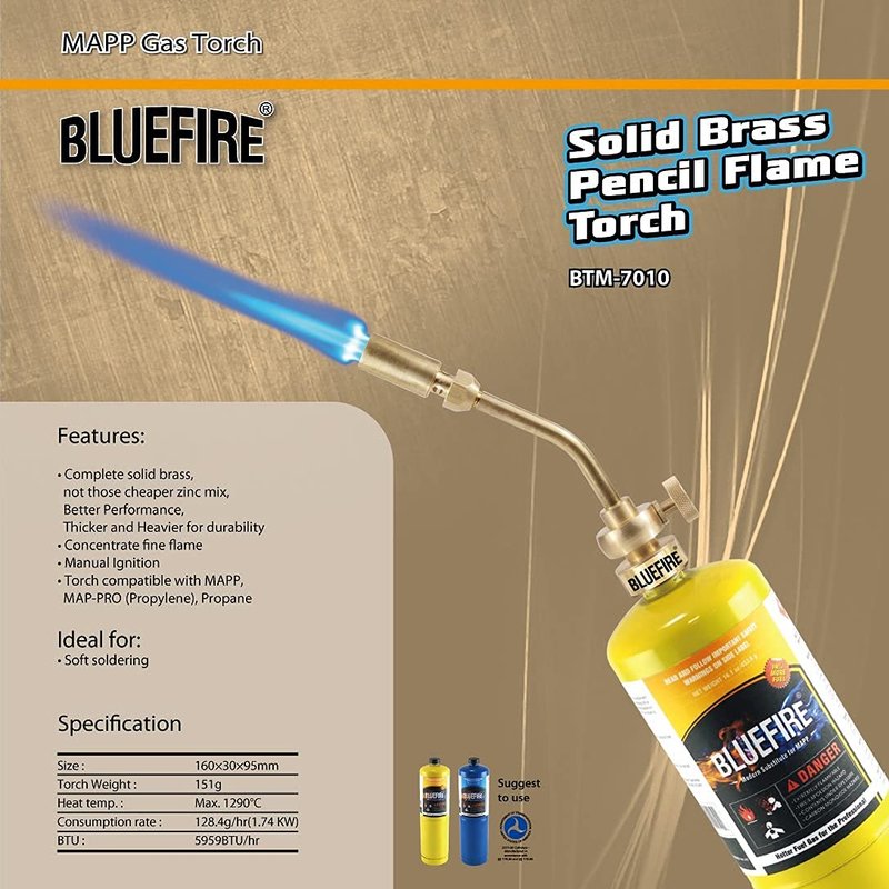 The MT-200 Brass Pencil Flame Torch is one of the most popular and versatile product in the portable gas industry, our unique product stands out from all others by its top quality and solid materials. It is professionally designed with optimized size and multi-function features for any home and commercial use in all circumstances, no matter big or small jobs. Flexible with popular fuel gas on market, such as MAPP, MAP-pro and Propane gas. Versatile with all working conditions, even including the hard-reaching shallow spaces such as under sinks, under roof, under vehicle and etc. Full brass constructed body and threading parts assure durability and reliability. The enlarged combustion tip is designed for strong pencil flame to provide both working precision and optimized heat output, meets the most common needs for both professionals and DIY fans. With recommended BLUEFIRE MAPP or other quality welding gas, this torch can easily handle soft soldering tasks, brazing copper tubing, thawing pipes, remove paint and tiles, melting, heating, and many other home and commercial purposes. Perfect tool for plumbing, air-conditioning, automobile repair and body works, Jewelry and beads making, DIY tasks, crafts and hobbies, cooking and grill, camping and outdoor activities, and etc.