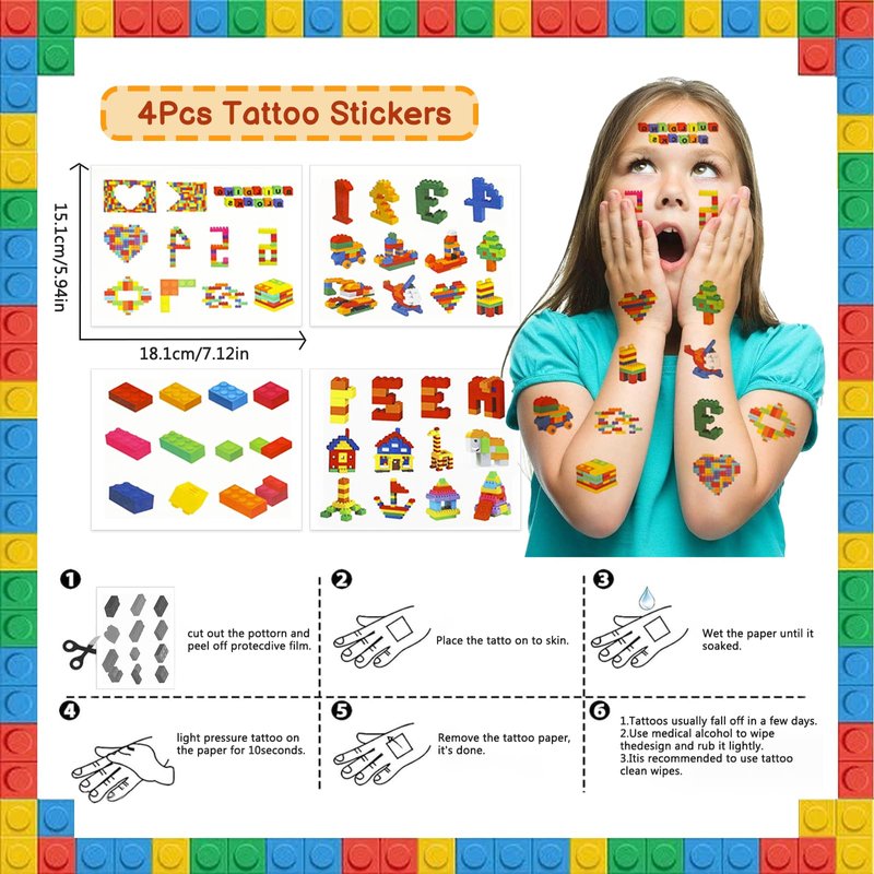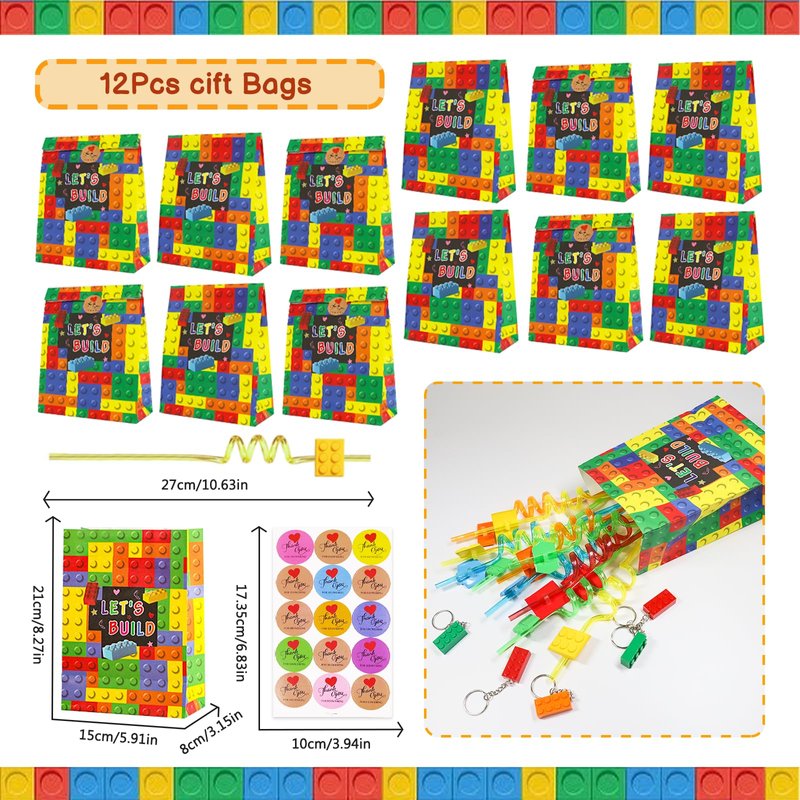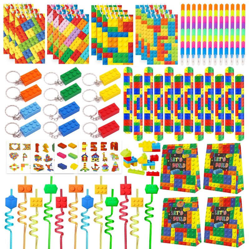 - Building Block Birthday Party Favors: Building Blocks Birthday Party Supplies contains 12 mini notebooks, 12 block pencils, 12 straws, 12 block themed party favor bags, 12 slap bracelets, 12 keychains, 4 sheets tattoo stickers(Each sheet contains 12 different designs), 20 pcs removable and assemblable block erasers. Fun, plentiful block party favors that brick lovers will love!