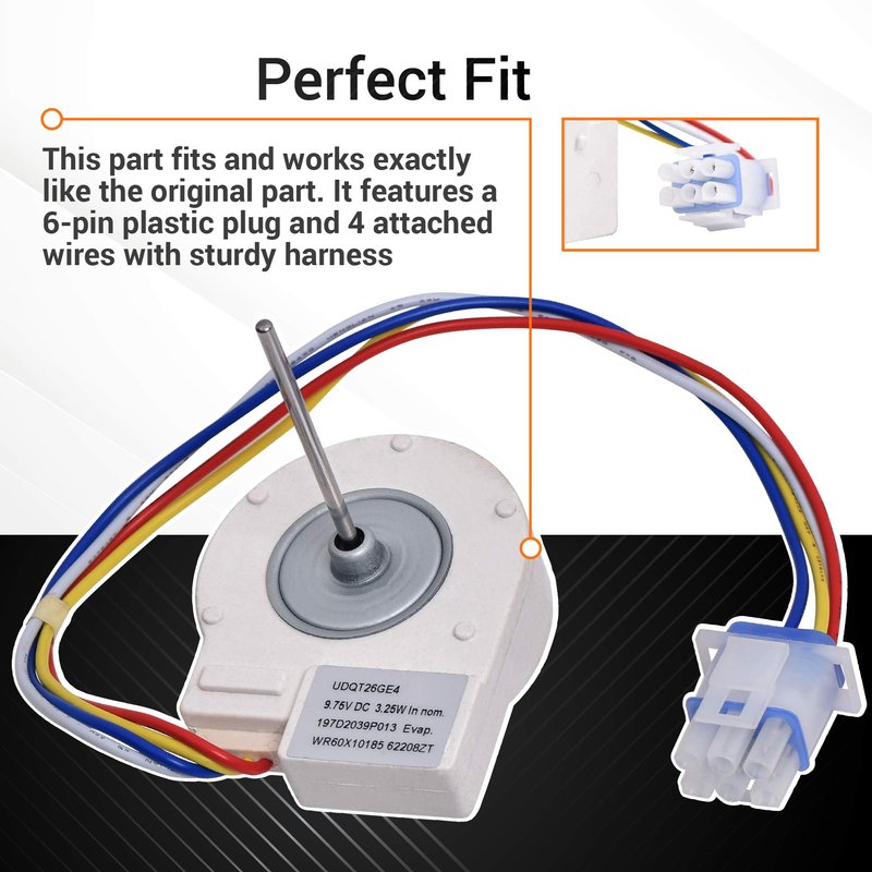 - ✅ PERFECT MATCH: WR60X10185 Refrigerator Evaporator Fan Motor (9.75V DC, 3.25W, 6-pin plastic plug, 4 attached wires) is the perfect fit for most brands and replace the following: 1170107, 197D2039P008, AP3875639, WR23X10346, WR23X10350, WR23X10353, WR23X10355, WR23X10364, WR23X10404, WR23X10405, WR23X10406, WR60X10043, WR60X10059, WR60X10068, etc. Feel free to contact us to check the model compatibility. We will be happy to assist you