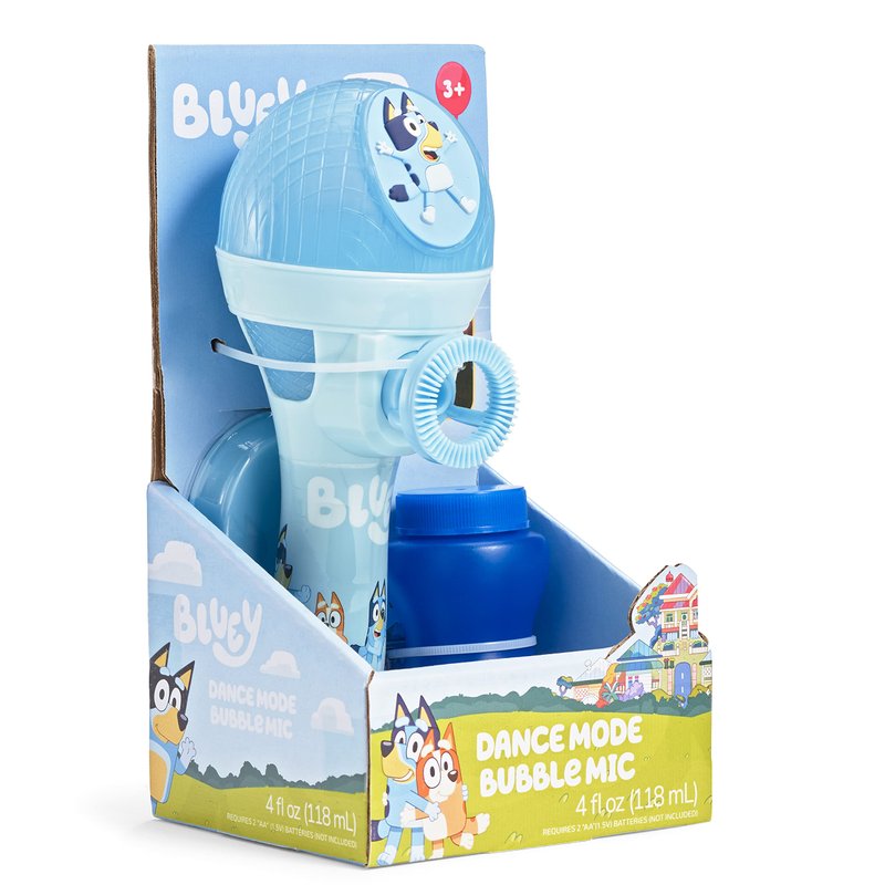 - INCLUDES: Bluey Bubble Machine Microphone and 4 fl oz of bubble solution. Requires 2 “AA” (1.5V) batteries, not included.