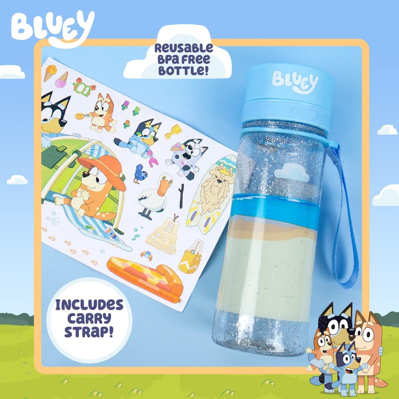 - KIT INCLUDES: 1 Bluey Glitter Water Bottle (13 oz.), 1 Sheet Removable Stickers (5 x 7 in.), Easy-To-Follow Instructions
