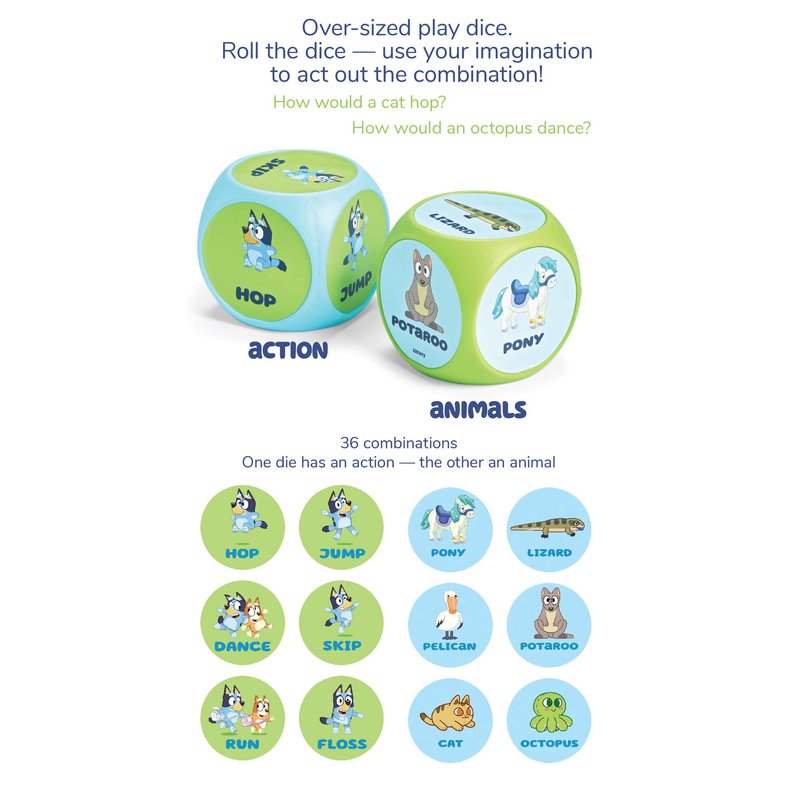 - INCLUDES: 1 action die featuring Bluey and Bingo poses and 1 animal die featuring fun animals from the show.