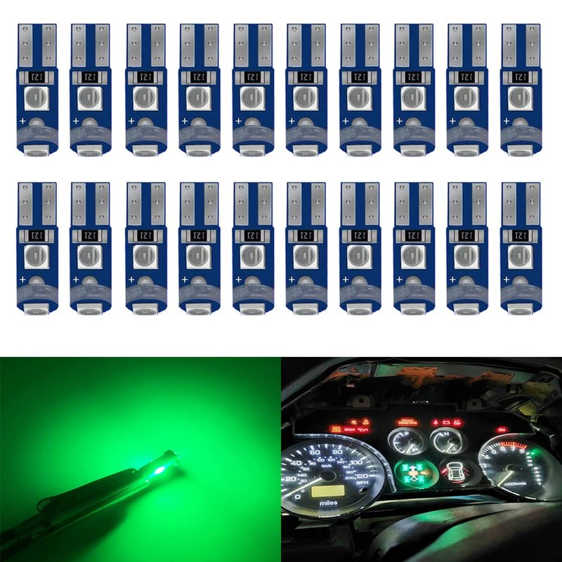 - Package: 20PCS T5 74 Bulbs LED Chips Type:3030SMD Chips QTY:3pcs/Bulb, Color:Green Voltage:DC12V Wattage:1W/Pair,0.5W/Bulb Output:0.0833A/Bulb Size:0.69inx0.24in(17.5mmx6mm) Lifetime:More than 30000 hours.