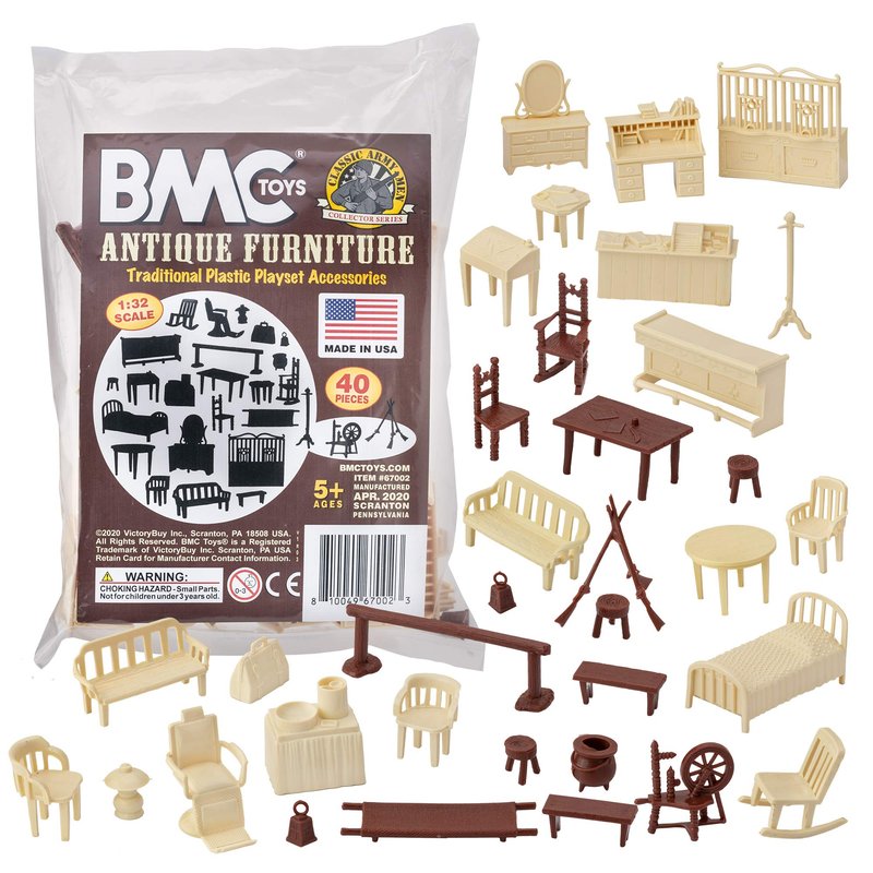 From the CLASSIC ARMY MEN COLLECTOR SERIES, BMC Toys brings back more classic playset accessories from yesteryear. This 40 piece set includes a variety of old-timey furniture and accessories. Pieces are made from slightly stiff cream and brown color HDPE plastic. Pieces include desks, chairs. benches, bed, bar, dresser, coat rack, barber chair, lanterns, brief case, spinning wheel, gun stack, cast iron kettle, and horse hitching post.