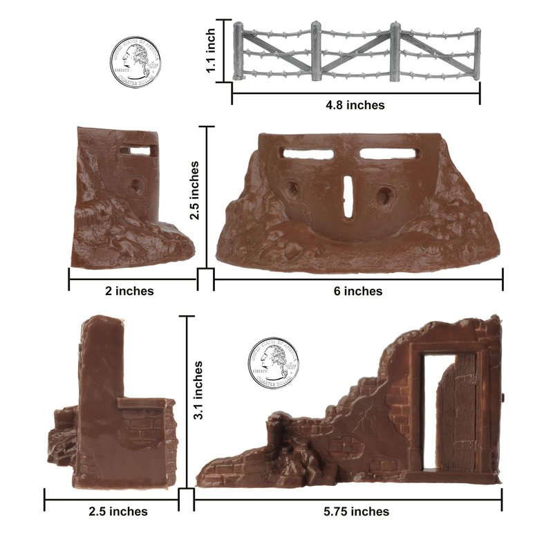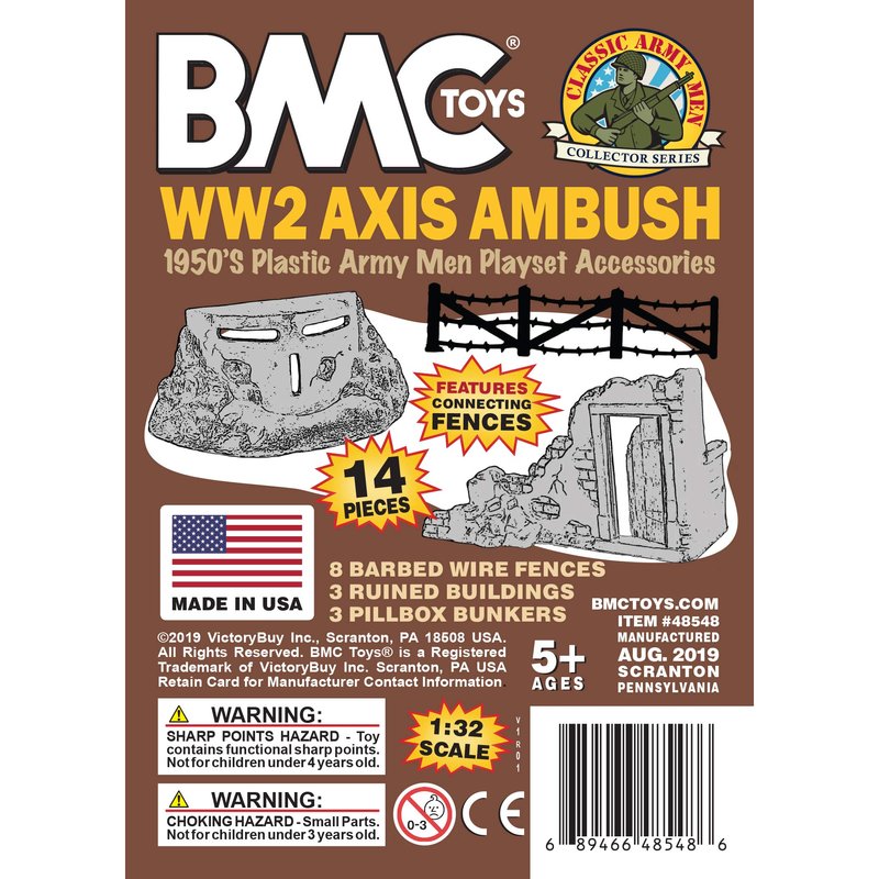 From the CLASSIC ARMY MEN COLLECTOR SERIES, BMC Toys brings back another American toy from yesteryear. This 14 piece of WW2 AXIS AMBUSH accessories includes 3 Pillbox Bunkers, 3 Ruined Building Corners, and 8 Barbed Wire Fence sections. All pieces are made from fairly flexible HDPE plastic and some pieces may have a little flashing. Pillboxes and buildings are brown color, and the barbwire fence sections are silver-gray. The fences measure 4.8 inches long by 1.1 inches tall and connect together to make over 3 feet of barricade. Please note the barbs are very pointy and should be handled with caution and kept away from children younger than 5 years of age. The pillboxes measure 6 x 2 x 2.5 inches tall and features 3 open loopholes for battle hardened firing positions. The building corners measure 5.75 x 2.5 x 3.1 inches tall and features a fixed partial door that offers excellent cover for an ambush.