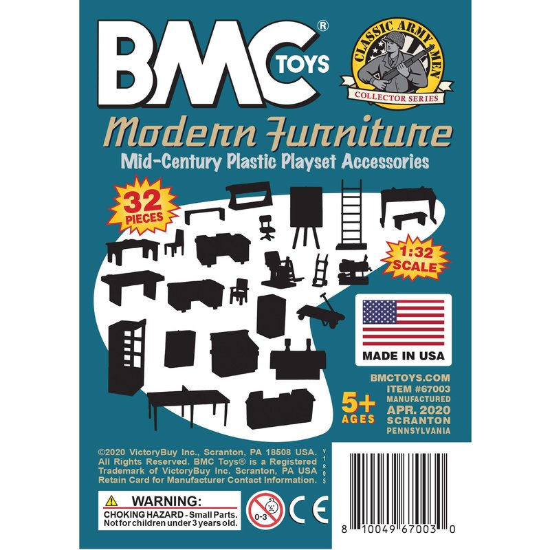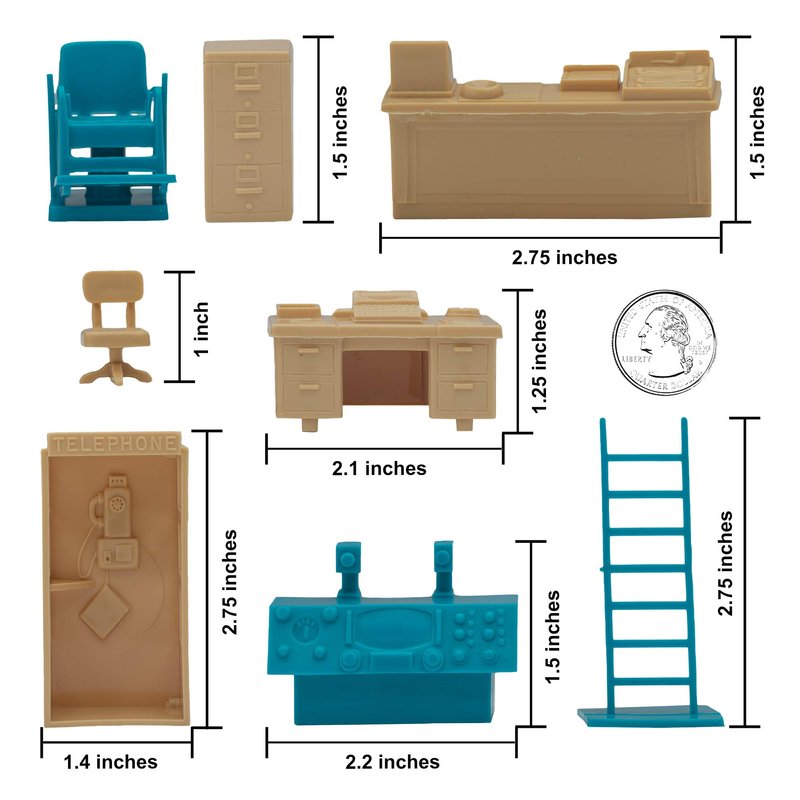 From the CLASSIC ARMY MEN COLLECTOR SERIES, BMC Toys brings back more classic playset accessories from the Golden Age of American Made toys. This 32 piece set is made from slightly stiff HDPE plastic with a variety of Mid-Century work, recreation, and school furniture and accessories. Almond-tan color pieces include desks, chairs, conference table, upholstered bench, shop counter, bank customer table, file cabinet, phone booth, exercise horse machine, ping-pong table, hand truck, cabinet with slanted top, skid with handle. Teal-blue pieces include teacher desk, chair, easel, ladder, 2 student desks, 4 student benches, salon chair, and quasi-futuristic stereo TV console.