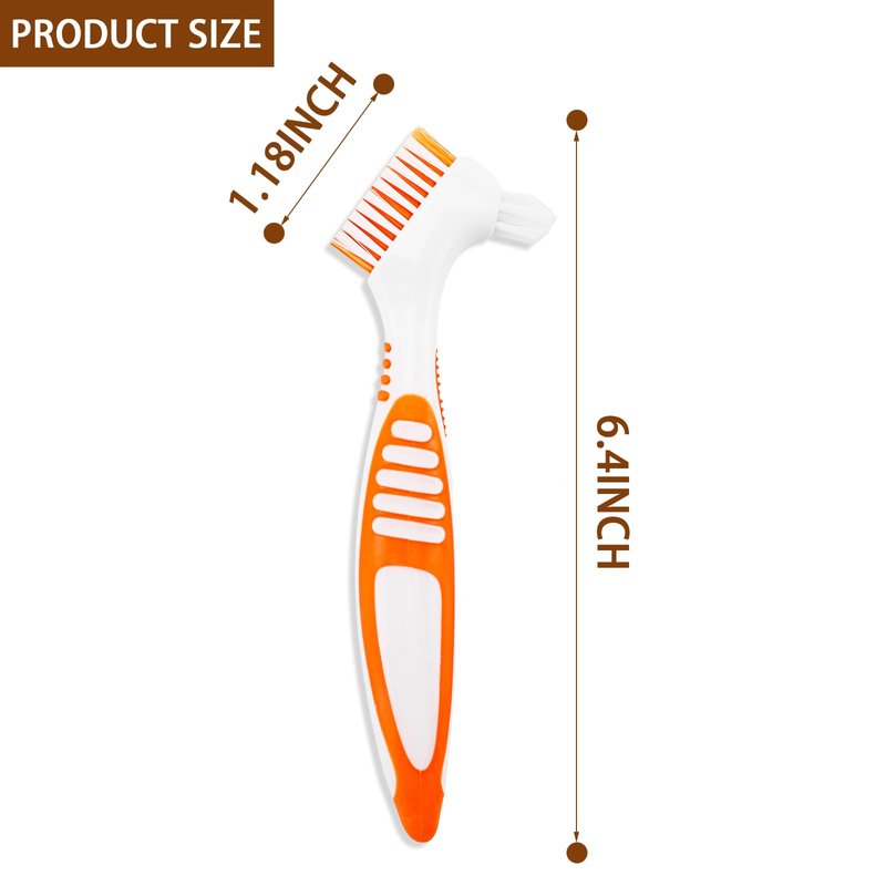 - Easy to use: The curved handle is easy to use, easy to hold in your hand with a firm grip, and the double-ended brush head cleans teeth easily and efficiently, keeping dentures sparkling clean after meals.