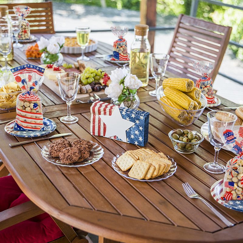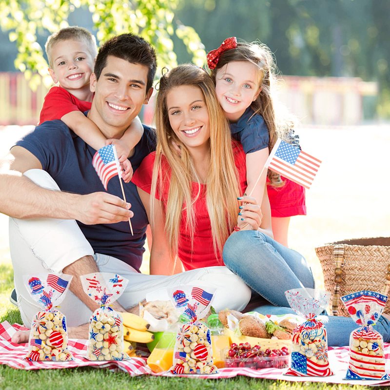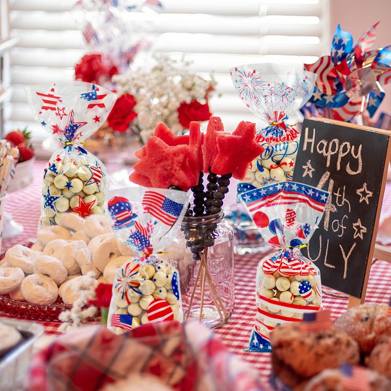 - 【Suitable Size】Patriotic cellophane bags are 28x13cm / 11x5inch The perfect size to hold many small items as you like, like cookies, snacks, toys, candy, greeting cards, gifts and more. Share their fun with friends and kids during Independence Day Party Favors.