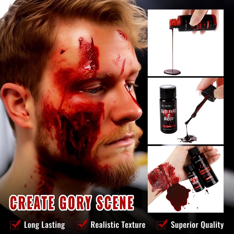 - 2PCS Fake Blood Makeup Kit: Harness the vivid intensity of fresh liquid blood for immediate wounds and blend with dark coagulated blood Gel for a seamless transition to aged, clotting injuries. Every wound stage, flawlessly depicted.