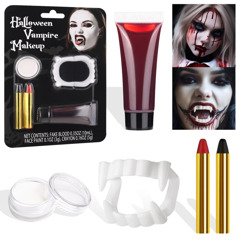 - 【Halloween Vampire Makeup Kit】Includes white face & body paint(3g), realistic fake blood(10ml), black & red face paint crayon(2.5g*2), vampire teeth fangs, this easy to carry fx makeup kit can satisfy your special effects makeup needs, allowing you to easily create realistic and natural wound special effects.