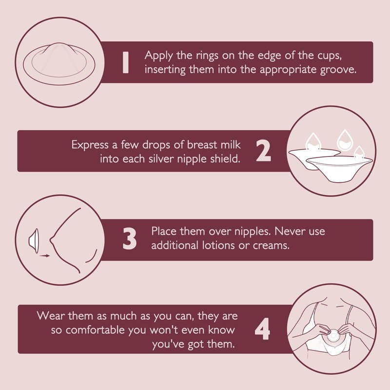 - Easy To Use: 1. Apply the rings on the edge of the cups, inserting them into the appropriate groove. 2. Express a few drops of breast milk into each silver nipple shield 3. Place them over nipples and never use additional lotions or creams. 4. Wear them as much as you can. They are so comfortable you won't even know you've got them.