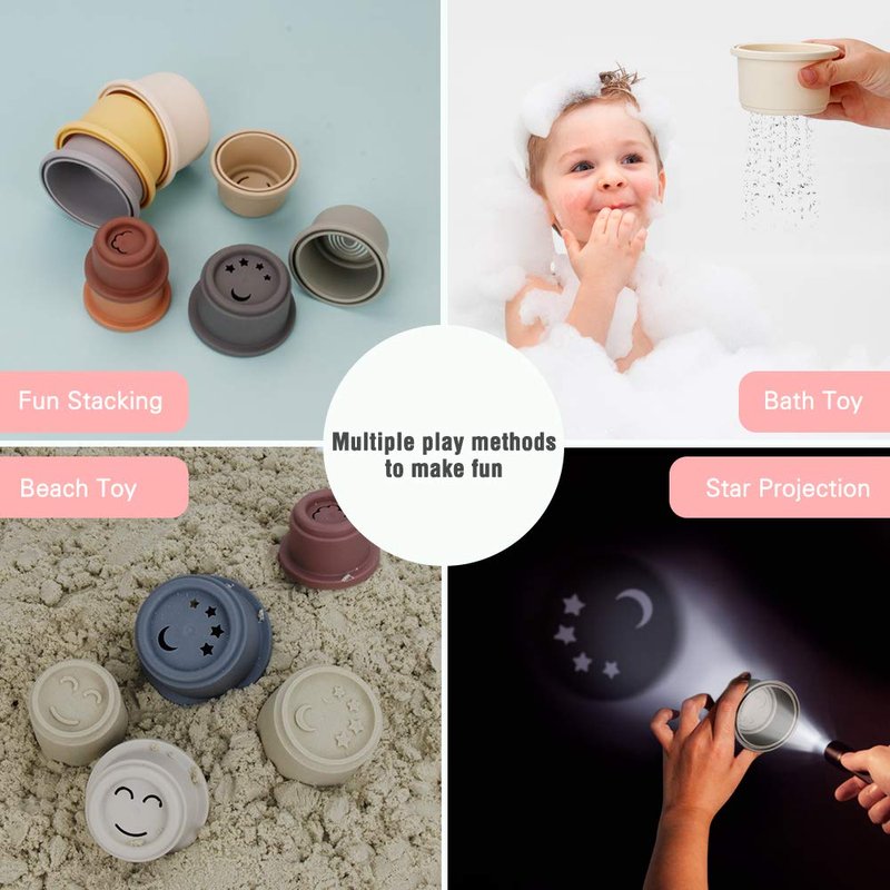 - Fun Cups Game - Children can stack high cups or compete with their friends in a speed stacking cups competition. Stacking toys can also be used as children's bath toys. When you go to the beach, kids can also use it as a tool to build a castle. In addition, it can also be used as a projection tool. The bottom of the cup has stars and other patterns, and the flashlight can project the starry sky to the baby through the cup.