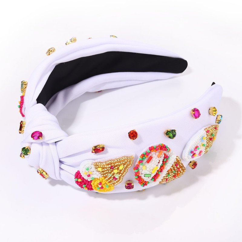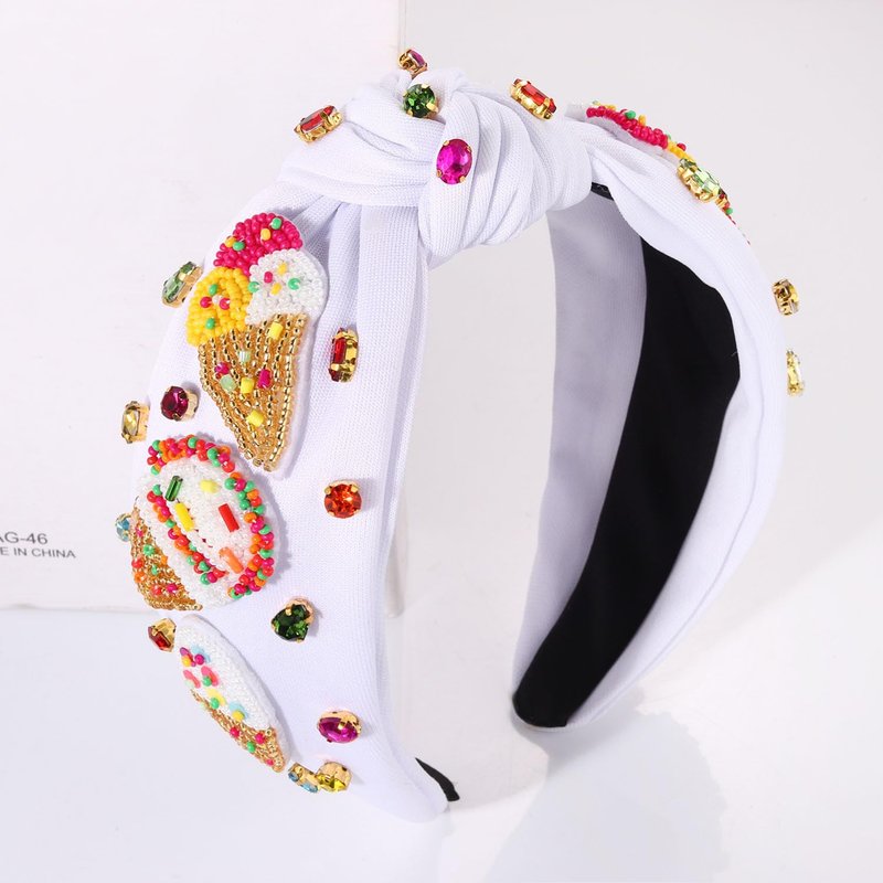 - Add a touch of summer fun and sweetness look with our ice cream headband,these cute headbands feature carefully arranged hand-sewn rainbow beaded ice cream and jewels embellishments for that extra sparkle on a white knotted headband. These fun summer headbands for women are more than just hair accessories - they are statement pieces that perfectly combine fashion and function.Show off your playful style with this unique beaded popsicle knotted headband