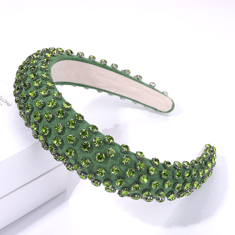 - Looking for a sparkly rhinestone velvet padded hairband that is elegantly simple?You'll look stunning in this beautiful green rhinestone headbands.Polyester fabric,Rhinestones accessory and plastic materials,Not easy to slip,soft elasticity,Comfortable and convenient to wear.completely sewn by hand without using glue.Width:approx 1.4 inch,Diameter:5.5 inch.