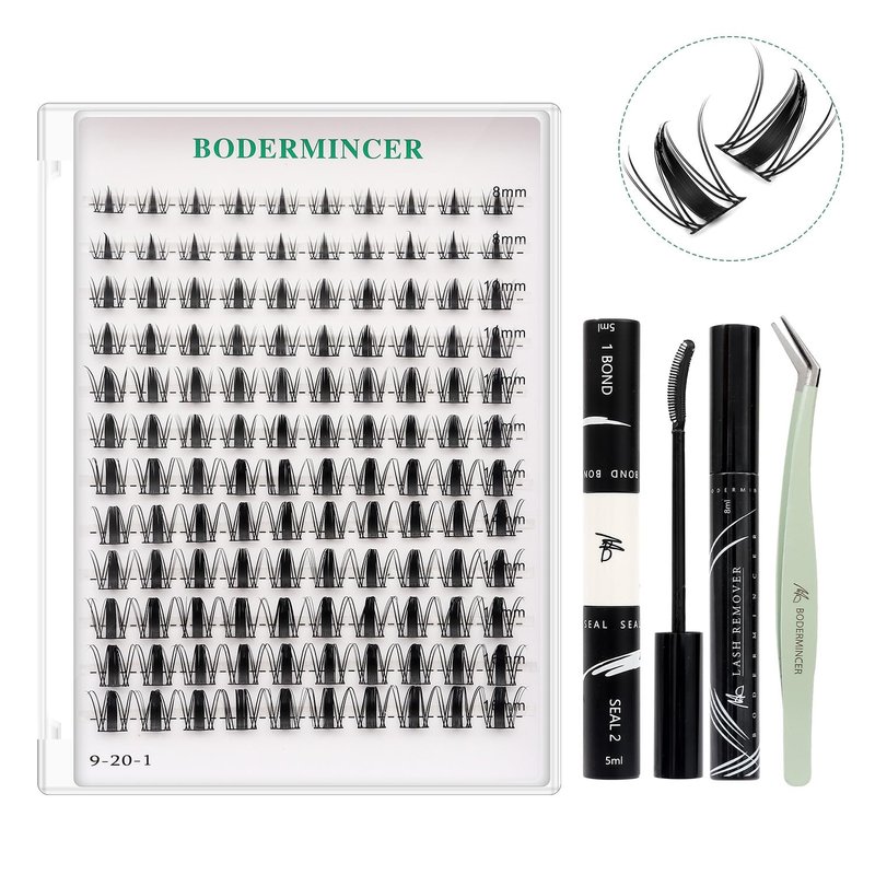 - Easy-Application Tips: Gentlely roll the lash band down with tweezers; Apply lash bond on your natural eyelashes; Place the lash clusters underneath your lashes; Use lash seal brush to lockProfessional Eyelashes Extension: BODERMINCER as a professional eyelash designer brand, we are committed to providing chic products, aimed at adding more glamour to our customers.