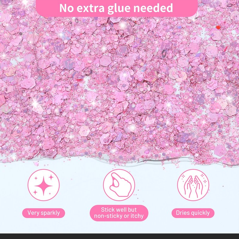 - FACE GLITTER,STICK WELL BUT NON-STICKY OR ITCHY:Music festival rave glitter are safety body glitter for kids,you do not have to worry about glue irritating your skin. The chunky glitter gel is neither watery or sticky,dries quickly but stick well