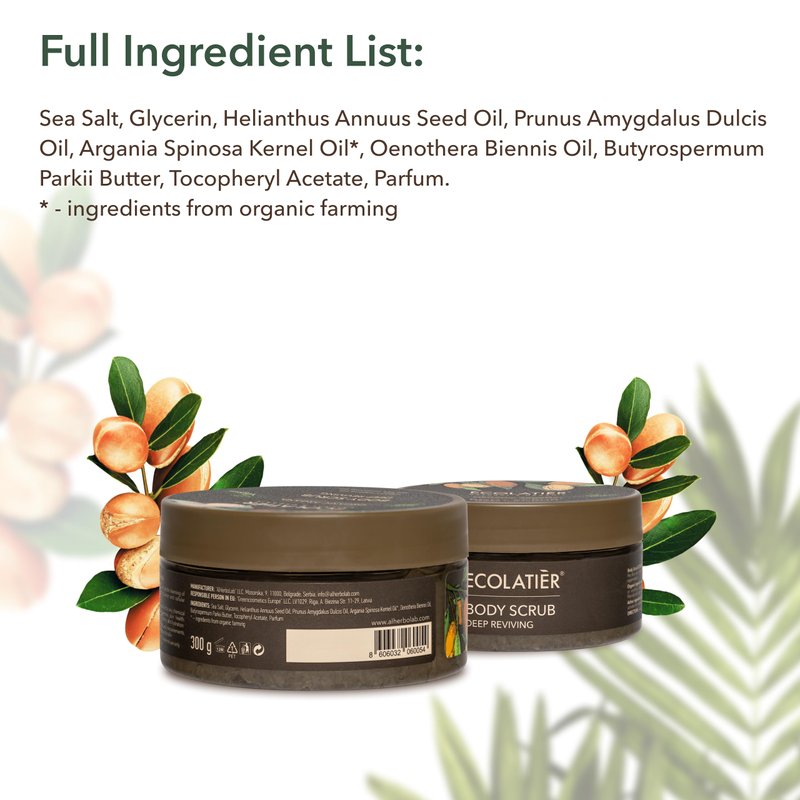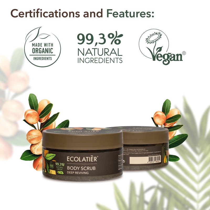 - Body exfoliator with organic argan oil, providing gentle yet effective cleansing. Combines deep hydration and exfoliation for silky, soft skin that’s visibly healthier.