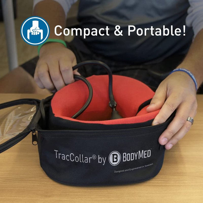 - COMPACT AND PORTABLE! The Body Sport TracCollar is a portable inflatable therapeutic traction collar that inflates to gently relax, stretch, and take pressure off muscles and joints for neck pain relief