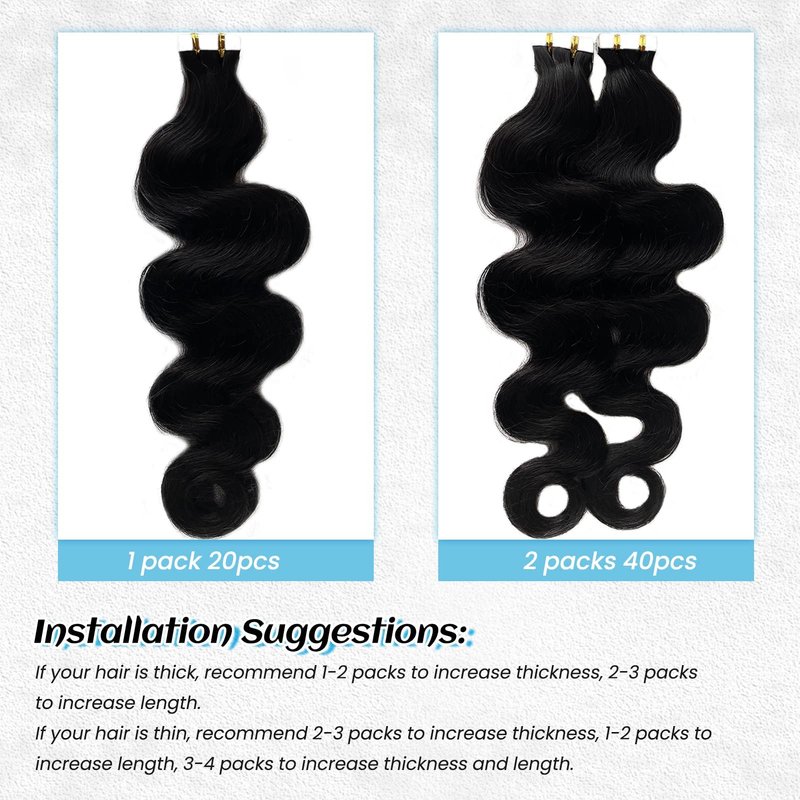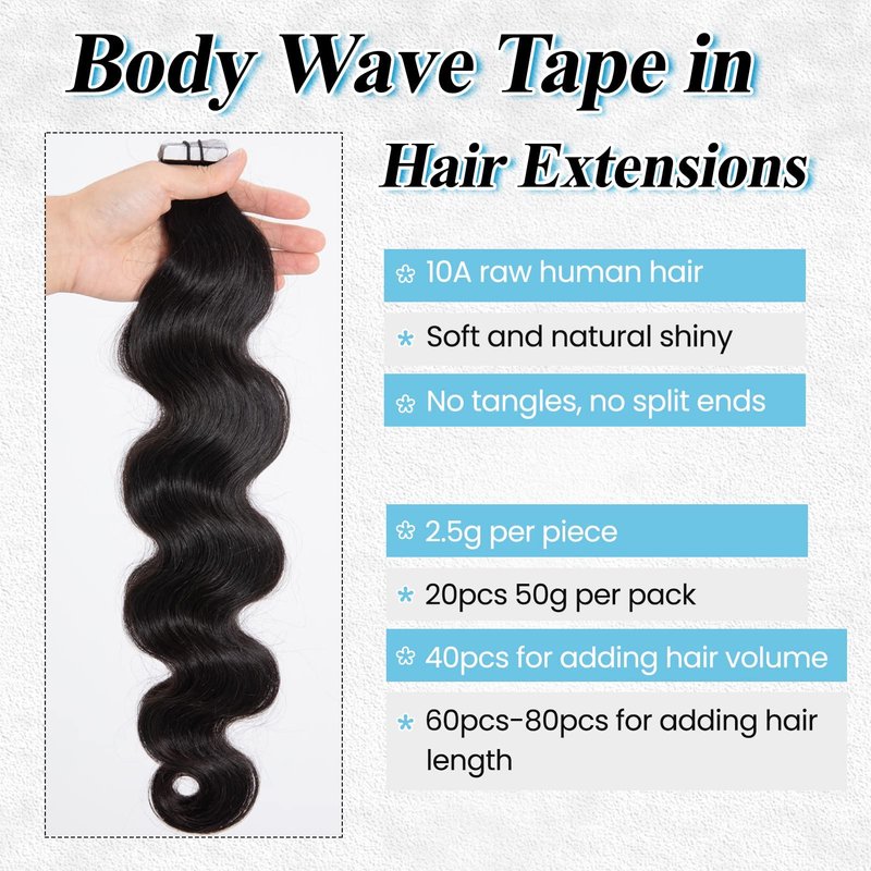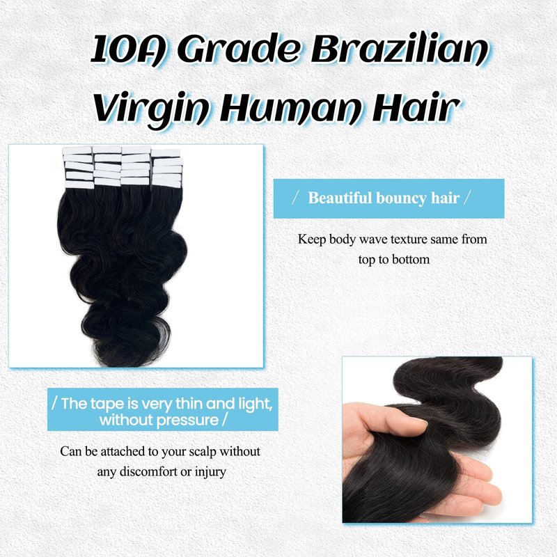 Tape in hair extensions is an easy way to add hair volume and length, you could DIY how many pieces and packs to us. Body wave human hair extensions looks just like your own hair, 10A grade human hair quality tape ins extensions is more durable.