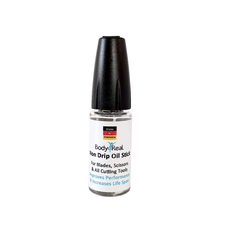 Hi Tech Oil Pen - For Clippers and all Metal Instruments Body4Real's Oil Stick is a high quality, non-drip clipper oil designed specifically for use on clipper, shaver and trimmer blades. In fact, it can be used on any cutting instrument from scissors to plyers. Well oiled blades improve cutting performance and extend blade life and ideally you should oil blades after each use. This High tech oil is superior to others as it contains no silicone and is dispensed via an anti-drip pen. This German-made synthetic care-oil is odor-free, transparent and free of silicon. Accordingly, it will not leave brown stains behind on your instruments, unlike mineral-based oils or sprays. It is also very easy to apply as the anti-drip valve allows every drop to be dosed with accuracy and precision. Applying a stronger pressure to the gripping surface allows larger areas, such as scissor blades and hair clipper blades, to be oiled as well. Silicon-free, no staining or crust formation on instrument surfaces. Provides precision dosage thanks to the patent pending safety valve Shake before use. Size: 10ml