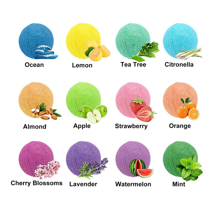 - 12 DIFFERENT SCENTS: Bath Bombs set includes 12 different scents. Unique handmade 12 x 1.8oz/50g/Pcs. There are different scents choices of Lemon, Strawberry, Watermelon, Almond, Orange, Citronella, Cherry -Blossoms, Lavender, Ocean, Tea Tree, Apple, Mint. The rich scents makes you feel as if you are surrounded by flowers or fruit, and the scents lingers on your skin