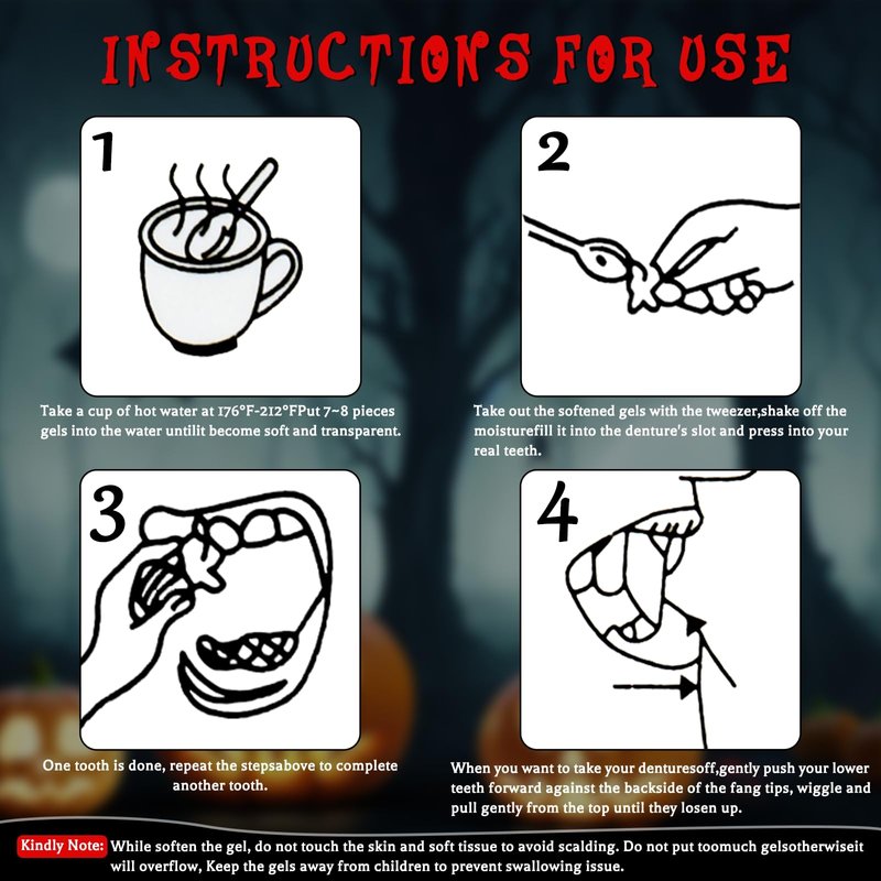 - EASY TO USE with ADHESIVE SET: Simply place the teeth adhesive beads in hot water until they turn clear. Remove them from the water and press them onto the fake fang to create a mold. Afterwards, press the fake fang onto your own teeth for a few moments. (Please note that the adhesive beads cool quickly, so you must work swiftly).