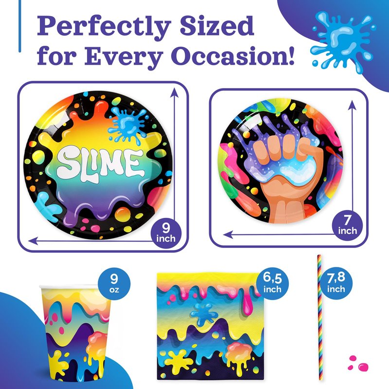 - SLIME FUN DESIGN: Dive into a world of colorful, squishy fun with our Slime-themed party set! Each piece is splashed with vibrant, multi-colored slime patterns that look as if they've leapt right out of a science experiment. Bright colors and fun textures make this set a hit for any creative child or slime enthusiast looking to celebrate their special day with a unique twist. Get ready to stretch, squish, and celebrate with this uniquely engaging party set!