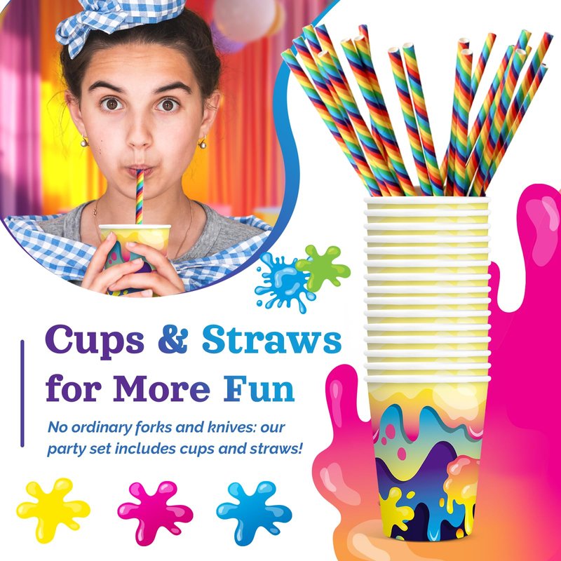 - 120-PIECE PARTY SET FOR 24: This set includes everything needed for a Slime themed birthday bash - 24 dinner plates (9''), 24 dessert plates (7''), 24 napkins (6.5''), 24 paper cups (9oz) and 24 matching paper straws, perfect for serving up to 24 guests