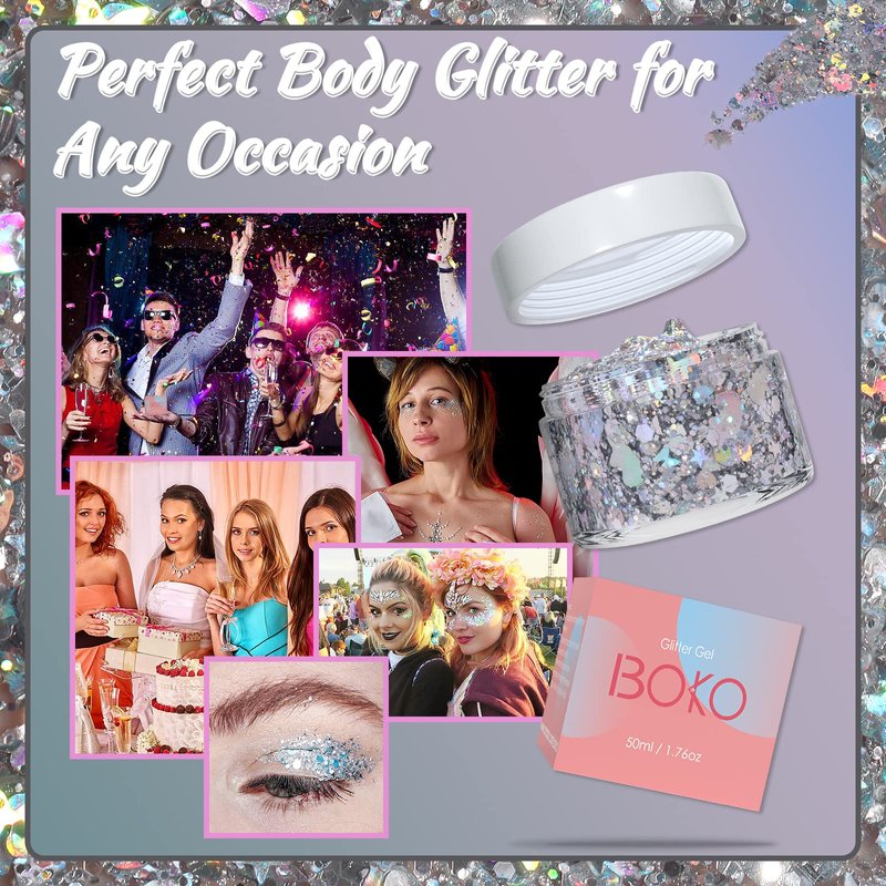- Shinny and Shimmer: BOKO body glitter lotion is made of high-quality, safe and non irritating materials. Without leaving the skin feeling tight or tingling. Glitter use high-quality materials to make them shimmer in the sun or light, making you the focus of parties, masquerade parties, Halloween, Christmas, or concerts.