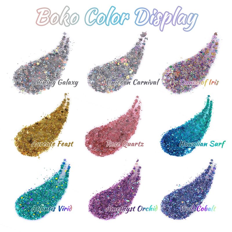 - Applicable to Any Scenarios: Boko hair and body glitter can be used to retouched your makeup such as for glitter hairspray, glitter eyeshadow, euphoria outfit. It can also be used for collarbones, shoulders, arms, and other parts. Whether for daily makeup, birthday parties, weddings, various festival dances, bars, or concerts, you can apply BOKO shiny sequins.